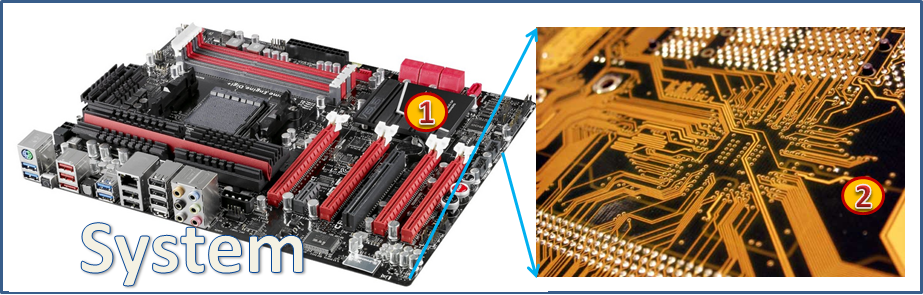 Fig.1 is a typical pc mainboard we usually see. There are many components, such as heat sinks, various capacitors and connectors on the board’s top layer. When flipped over, we also see that there are many solder points and routing traces like Fig. 2. System like this is the scope of our analysis. Note that it doesn’t have to be a PC system… mobile phone, embedded devices or even high-end server are also treated the same. They are just different in terms of circuit size and scale.