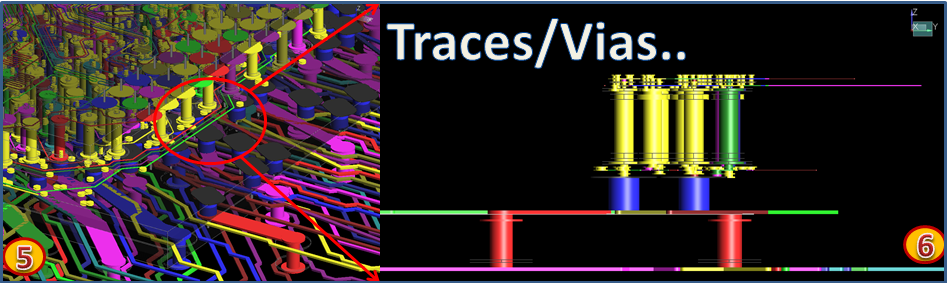 If we further zoom in to the edges around these chip’s pins, and visually in a 3D view (Fig. 5), One may see that there are many vertical cylinders making transitions between different layers. As a package and sometimes sockets sit between silicon chip and underlying mainboard, and a system board is also mostly composed of more than top and bottom layers. These cylinders are called “Via”. A cross-section view makes these via transitions more clear. Conducting traces are extended outwards like roads carrying electrons leaving the central hub.