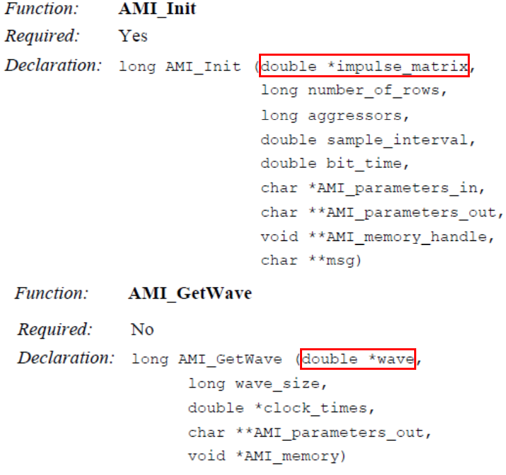 While there are five AMI API functions defined in the spec., most important ones are AMI_Init and AMI_Getwave. From their signature shown above, we can see that the same pointer (impulse_matrix for AMI_Init and wave for AMI_GetWave) are used for both input and output. That is, the data are passed-in, the AMI functions need to calculate the response based on this black box’s behaviors, then fill the output response back in to the same pointer to return to the simulation platform on top. This can be depicted with a schematic to depict more or less like the one below: