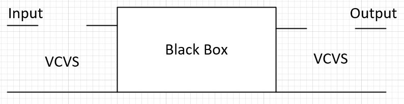 The assumptions implied implicitly in AMI channel simulation is that the input impedance to the AMI model (black box above, such as Rx model) are infinitely high, same for the output stage of a AMI Tx circuit. So we can imagine two voltage controlled voltage sources (VCVS) with gain = 1 are used at both input and output ends, with the AMI model sitting in the middle to transfer circuit block’s response between stages.