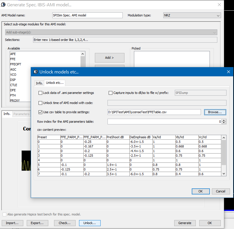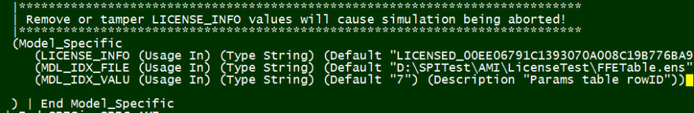 Simply speaking, one can embed lots of information in the .ami file to convey to the underneath .dll/.so models. Common encryption can be used to protect sensitive information. For example, the reason why SPISim can release our AMI models for free to generate and use is because our AMI .dll/.so files require a license setting and a time stamp and/or data dependent values are part of the license info. Thus, a model will expire after certain time, the parameters can be changed if locked, and the license info can’t be tampered.