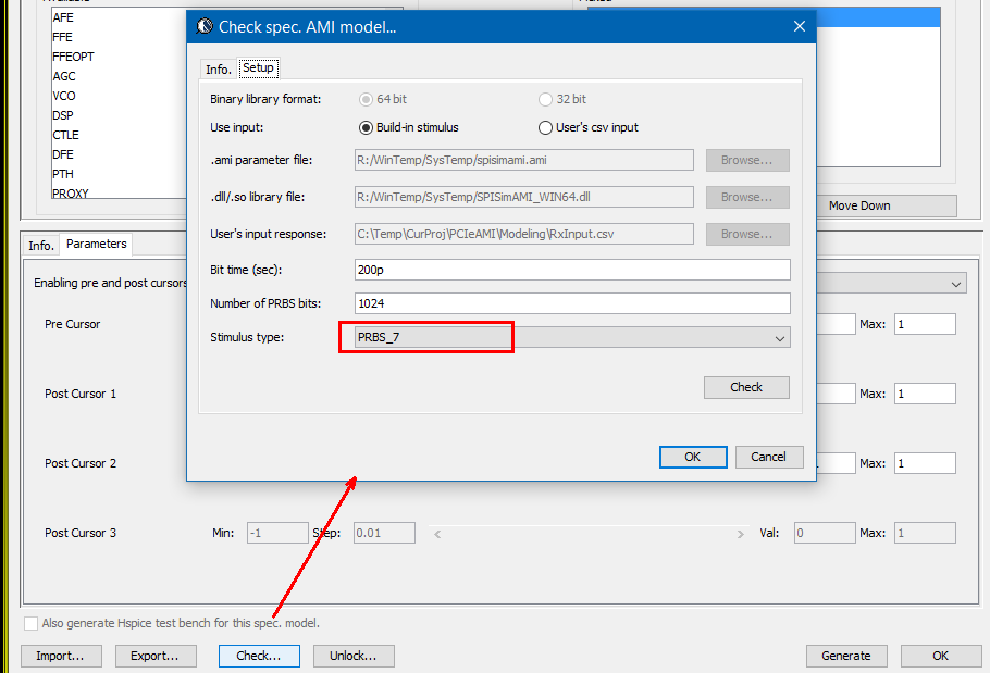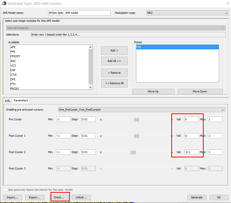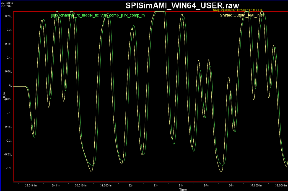 Because these two variables are independent, we can first identify the peak value as “Swing” from the .tr0 simulation results, then use bi-section to adjust the FFE_PARM_POS1 such that the output from SPISimAMI for this .ami file settings and SPISim’s spec .dll/.so will match the tr0 data.