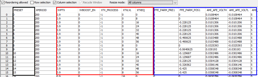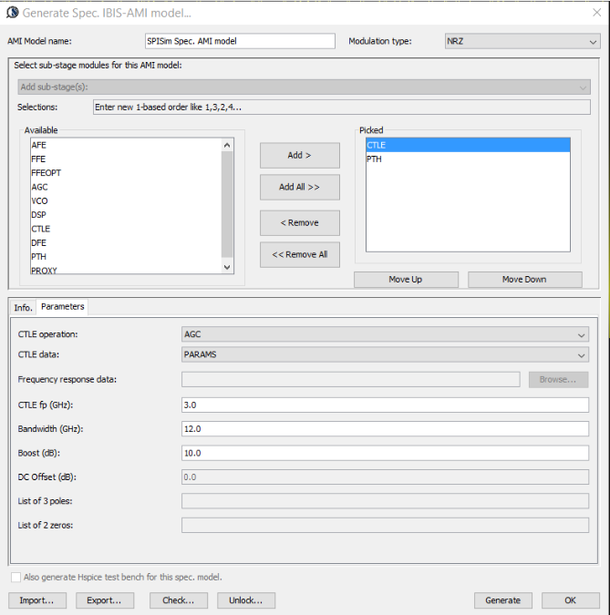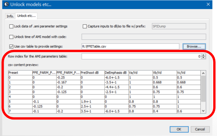 One unique feature of SPISim’s AMI model is it supports of table look up and up to two dimensional linear interpolation for numerical values not found. The set-up is easily done from model config. GUI. The example below is for PCIe with 11 preset tables.