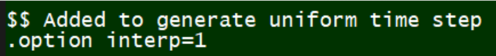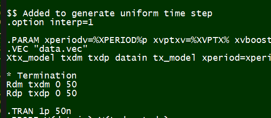 Note that in order to perform what-if analysis of next step, we also use VPro to capture inputs to these Tx and Rx models so that they are evenly spaced.. as required by AMI’s Init and GetWave function. These evenly spaced inputs will be used later on by SPISimAMI.exe to drive the model. For HSpice, the following option may be needed so that the .tr0 file will have evenly spaced data points even simulation is various time-step sized: