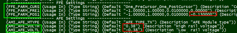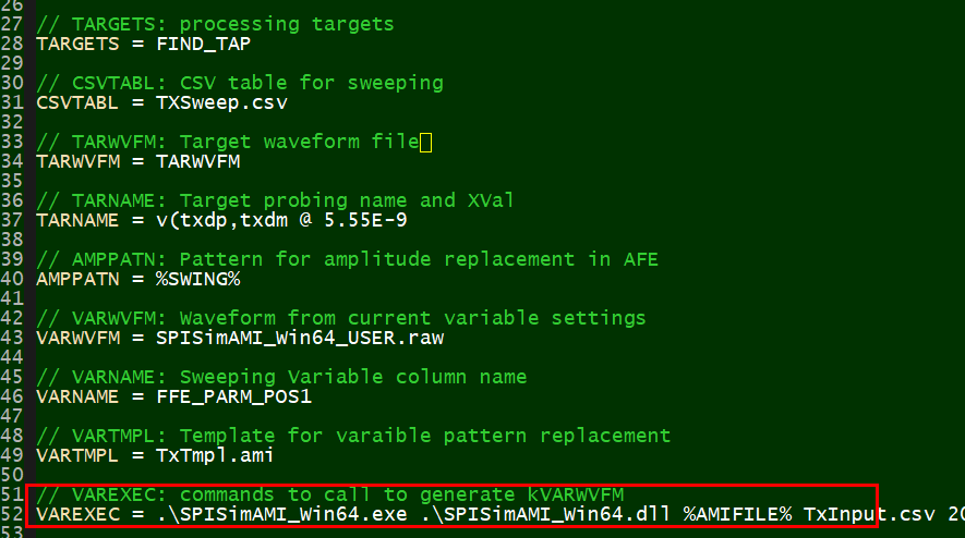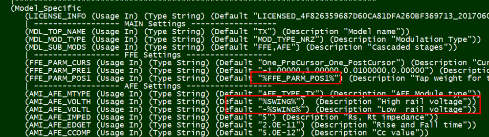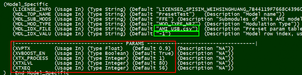 The columns boxed in blue above are those required for SPISim’s AMI spec models. These columns has header named exactly the same as those in the ami file green boxed below. The row entries for settings of each test case in the csv table is filled in to the boxed in red in ami file below.