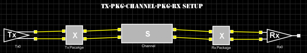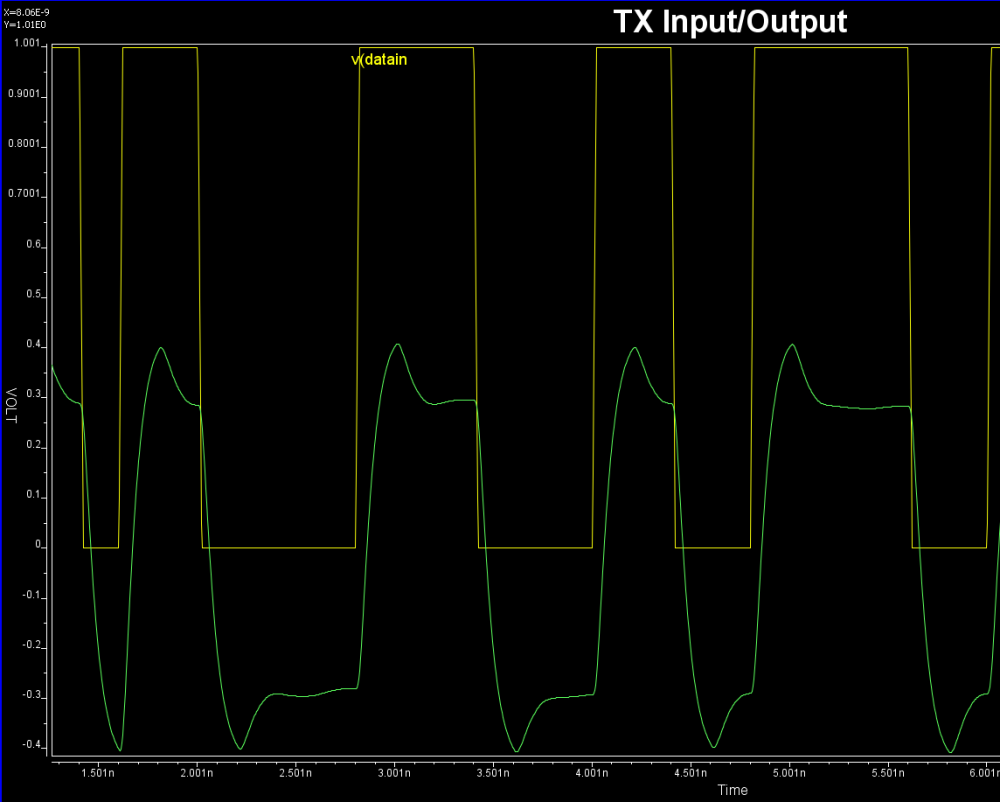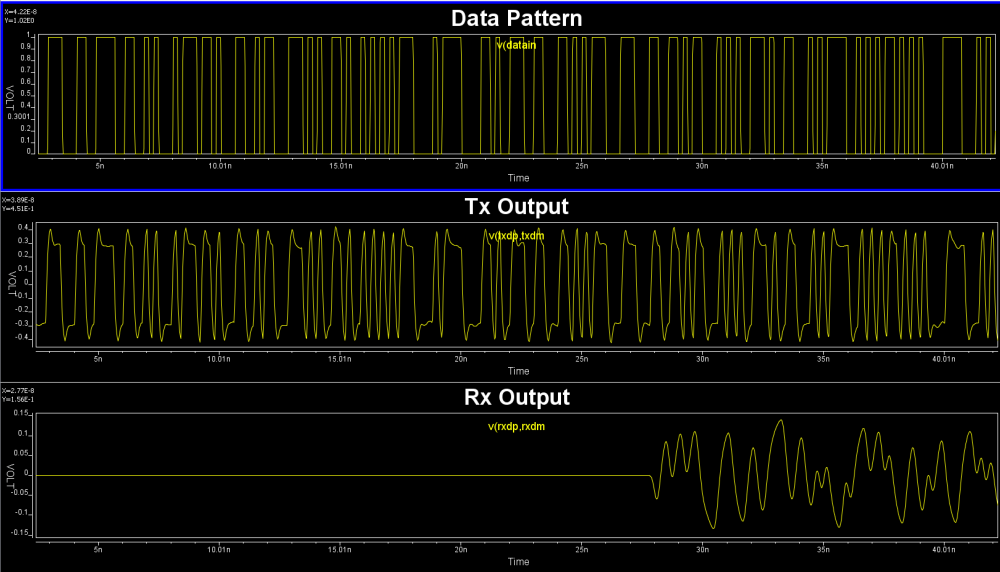 Both Tx and Rx are encrypted hspice models with adjustable parameters. When picking one set of parameters to test run the channel test bench, we get valid simulation results.
