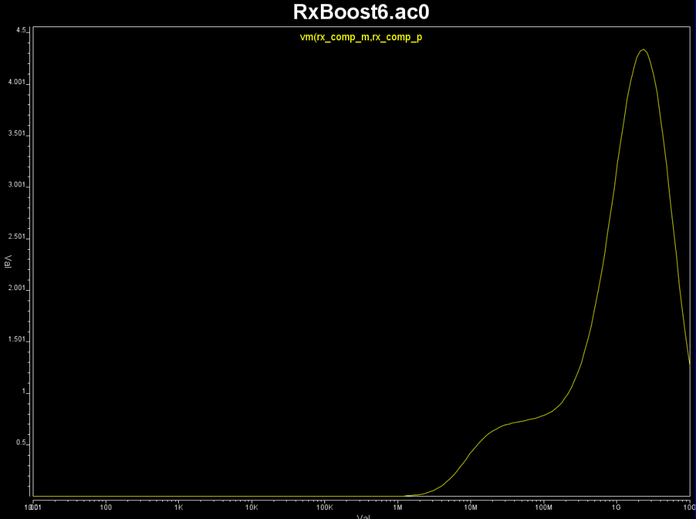 From these eye plot, we do not see DFE like abrupt force-zero output, thus the Rx model seems to be a CTLE like boost filter. So we created Rx test bench like below and obtain its frequency response: