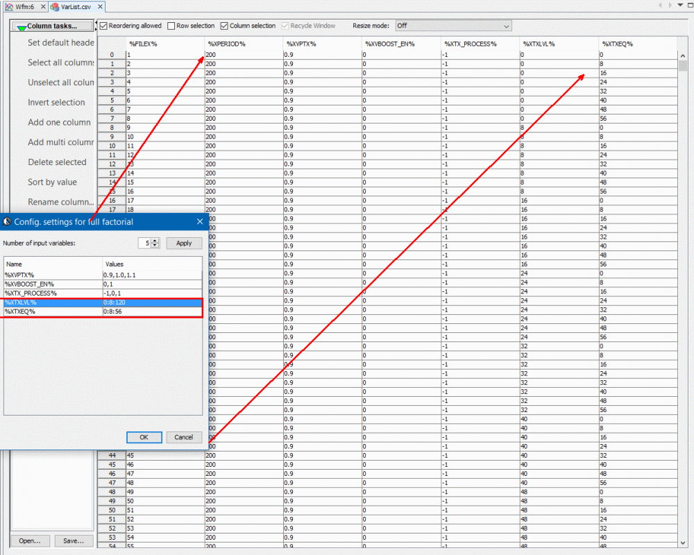 For these five variables, we use MPro to generate 2403 test case (1/60 of full factorial). We then create a template from the Tx spice test bench so that parameters can be updated according to the table and its column header above: