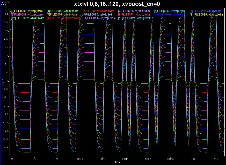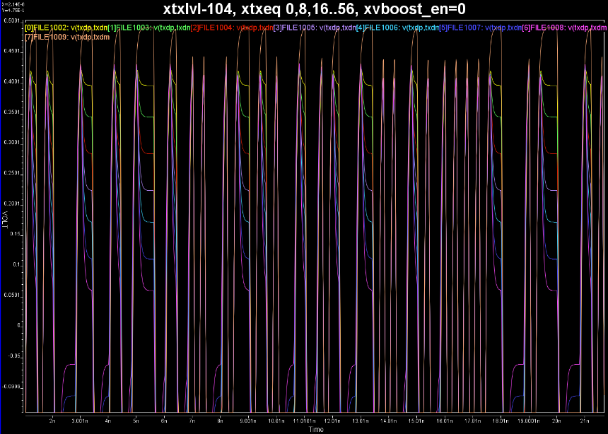 Notice that the slew rate and peaks are not affected by de-emphasis level much. In addition, the spacing seems linearly spaced according to the bit settings. With this, we can sweep them independently.