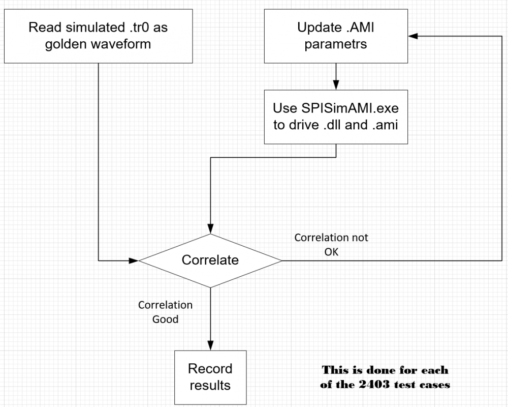 With all results being available, next step is to find corresponding AMI parameters for each of the case. SPISim’s model driver, SPISimAMI.exe, is a must have here. It will take the collected, evenly spaced inputs to drive the AMI parameters together with the SPISim’s spec. model, output results can then be correlated with the .tr0 file simulated with HSPice for that particular case. In case when the correlation is not good, AMI parameters should be updated again for another iteration of performance matching. This process is summarized in the flow below: