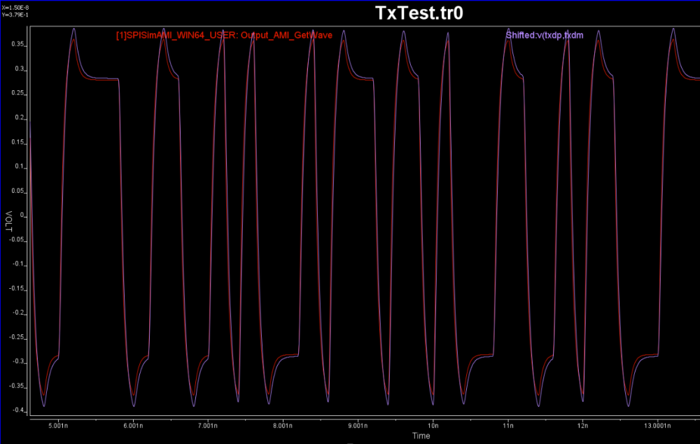 With several trial-and-errors, all within SPISim’s Spec-AMI GUI, we obtained the following Tx correlation between spice test bench and AMI results for this particular set of parameters: