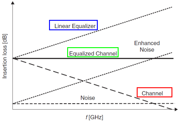 In reality, such all pass filter does come often. In order to compensate our lossy channels (as indicated by the red box) to be more like the ideal case (green box) as an end result, we need to apply equalization (indicated by blue box). This is why an equalizer is often used… basically it provides a transfer function/frequency response to compensate the lossy channel in order to recover the signal quality. A point worth taken here is that the blue box and red box are “tie” together. So using same equalizer for channels of different losses may cause under or over compensated. That is, an equalizer is related to the channel being compensated. Another point is that CTLE is just a subset of such linear equalizer.