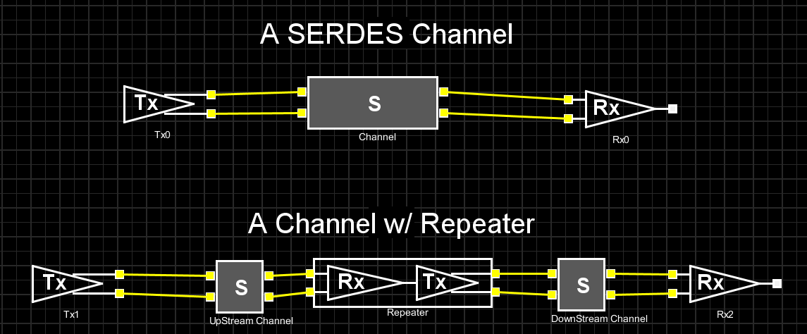 The picture above shows two common SERDES channel setups. While the one at the top has a direct connection between Tx and Rx, the bottom one has a “repeater” to cascade up stream and down stream channels together. This “cascading” can be repeated more than once so there maybe more than two channels involved. CTLE may sit inside the Rx of both set-ups or the middle “ReDriver” in the bottom one. In either case, the S-parameter block represents a generalized channel. It may contain passive elements such as package, transmission lines, vias or connectors etc. A characteristic of such channel is that it presents different losses across spectrum, i.e. dispersion.