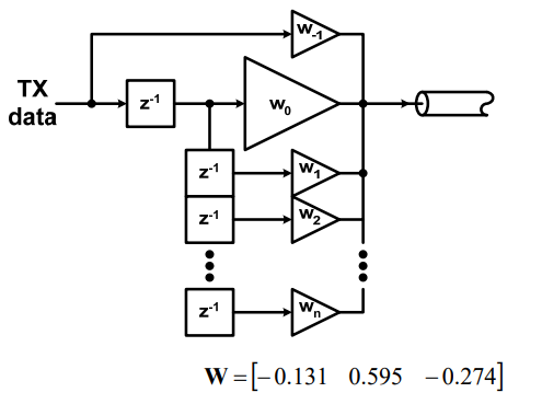 FFE’s behavior is more or less easier to predict and its AMI implementation is also quite straight forward. For example, a single pre-tap or post-tap’s FFE response can be easily visualized and predicted: