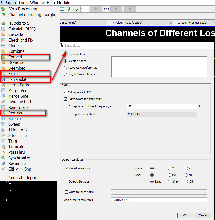 2. Extract from S-parameters: Another way to obtain frequency response is from EQ circuit’s existing S-parameter. This will provide best correlation scenarios for generated AMI model because the raw data can serve as a design target. However, there are many intermediate steps one have to perform first. For example, the given s-parameter may be single ended and only with limited frequency range (due to limitation of VNA being used), so if tool like our SPISim’s SPro is used, then one needs to: reording port (from Even-Odd ordering, i.e. 1-3, 2-4 etc to Sequential ordering, i.e. 1, 2 -> 3, 4), then convert to differential/mixed mode, after that extrapolate toward dc and high frequencies (many algorithms can be used and such extrapolation must also abide by physics) and finally extract the only related differential input -> differential output portion data.