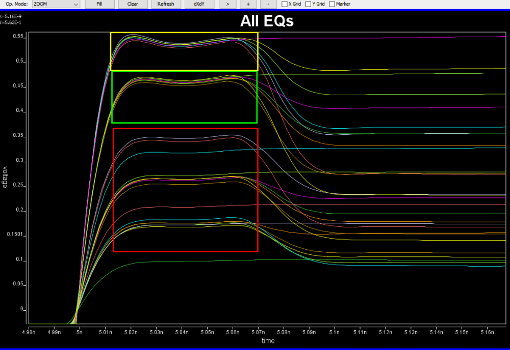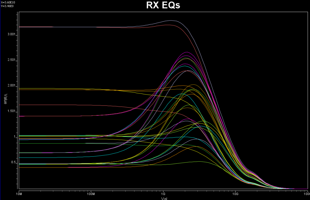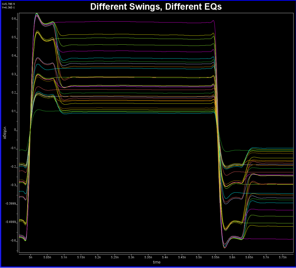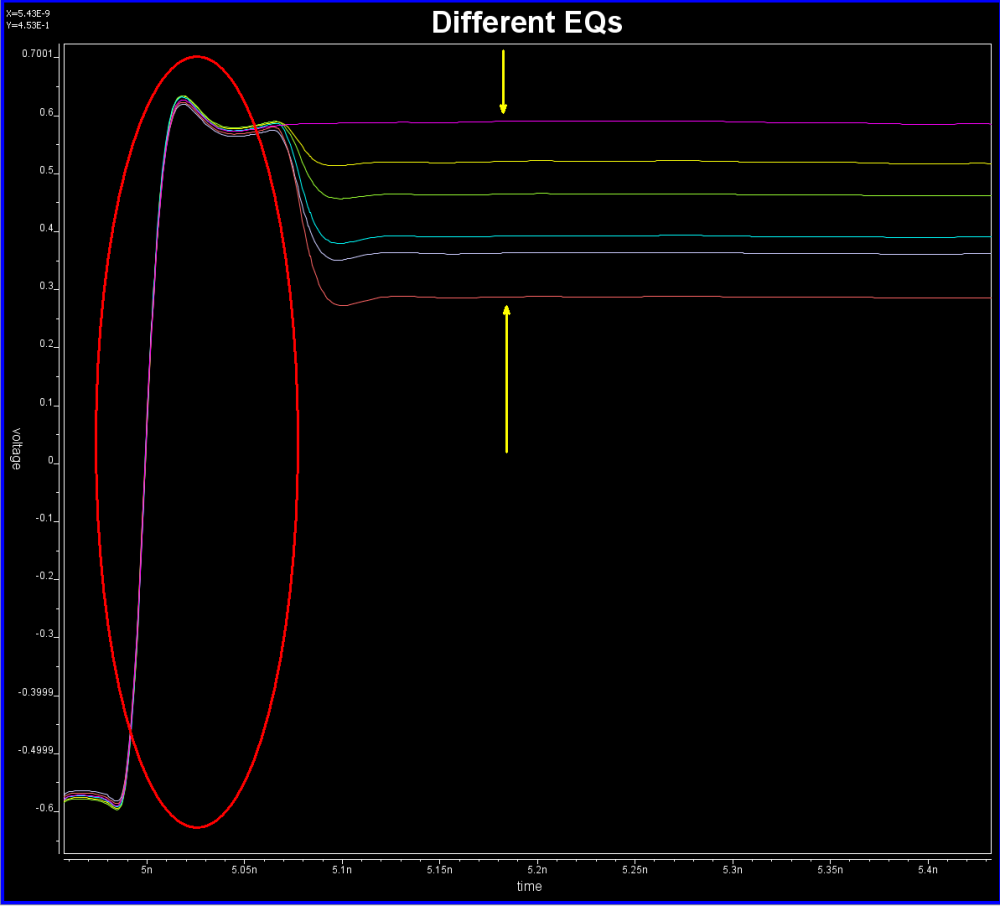 Take the plot above as an example. This is a FFE EQ circuit. The flat lines indicated by two yellow arrows are different de-emphasis settings, thus controlled by AMI. However, the rising/falling slew rate, wave shape and dc levels etc as circled in red are all analog behaviors. Thus an accurate IBIS model must be created first to establish the base lines for equalization. Recently, BIRD 194 has been proposed to use touch-stone file in lieu of an IBIS model… still the analog model must be there.