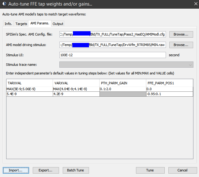AMI’s data can be obtained from different sources: circuit simulation, lab/silicon measurement or data sheet. For simulation case, simulation must be done and the resulting waveform’s performance needs to be extracted. These values will serve as a “design targets” based on whitch AMI model’s parameters are being tuned.