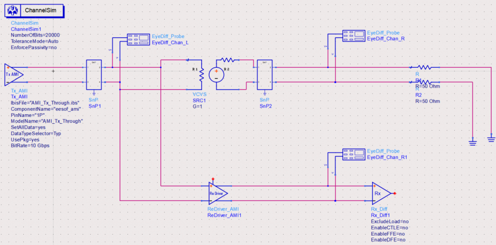 The model validation mentioned in previous section is only for a single model, not the full channel. So one still needs to pick several full channels set-up to fully qualify the models. A caveat of the channel analysis is that it only shows time domain data regardless the flow is “statistical” or “bit-by-bit”, that means it is often not easy to qualify frequency domain component such as CTLE. In this case, a corresponding s-parameter whose Sdd12 (differential input to differential output) is represented by this CTLE AMI settings can be used for an apple-to-apple comparison, like schematic shown below: