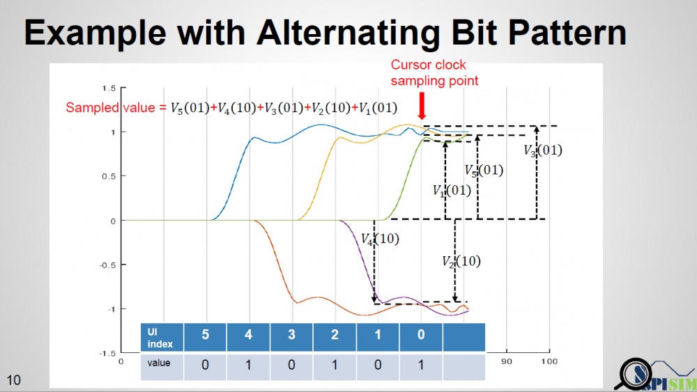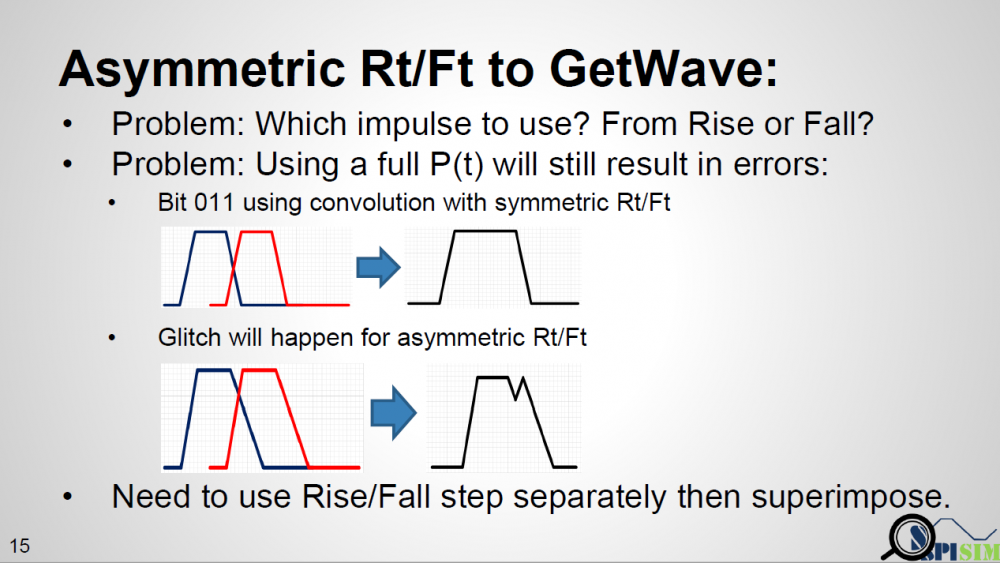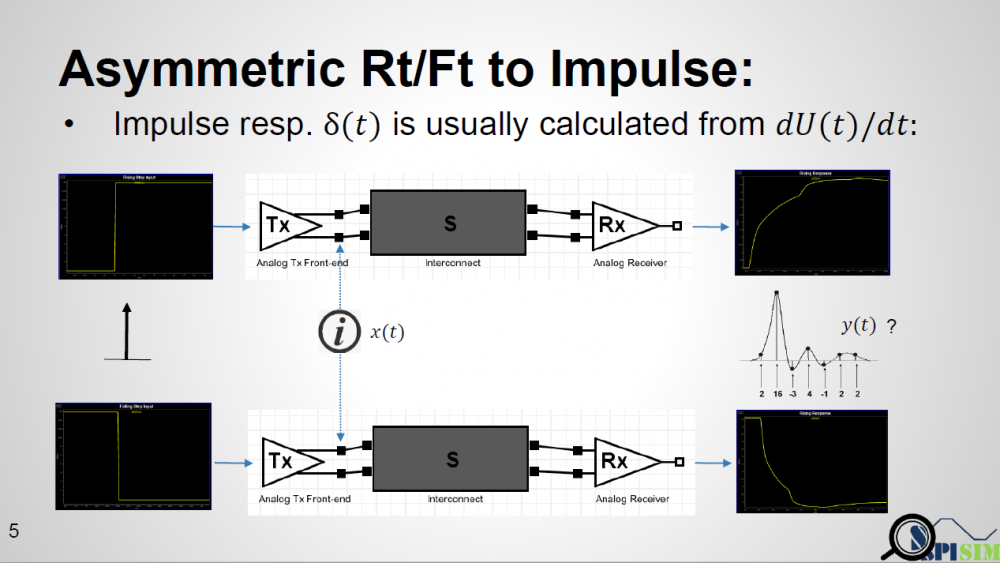 One example is like shown in top half of the picture above. If a simulator takes that equalized digital input and “simulate” to get final response, then this “simulation process” should have taken different Rt/Ft into account and has valid results. However, this process will be slow and I don’t think any simulator is doing it this way. Furthermore, the spec. specifically say it needs to “convolve” with impulse response. First of all, this impulse can be from rising or falling. Secondly, even we decide to decovolve with input first (thus has sequences of different delta response) then convolve with pulse response (i.e. one simulated UI), will there be any issue?