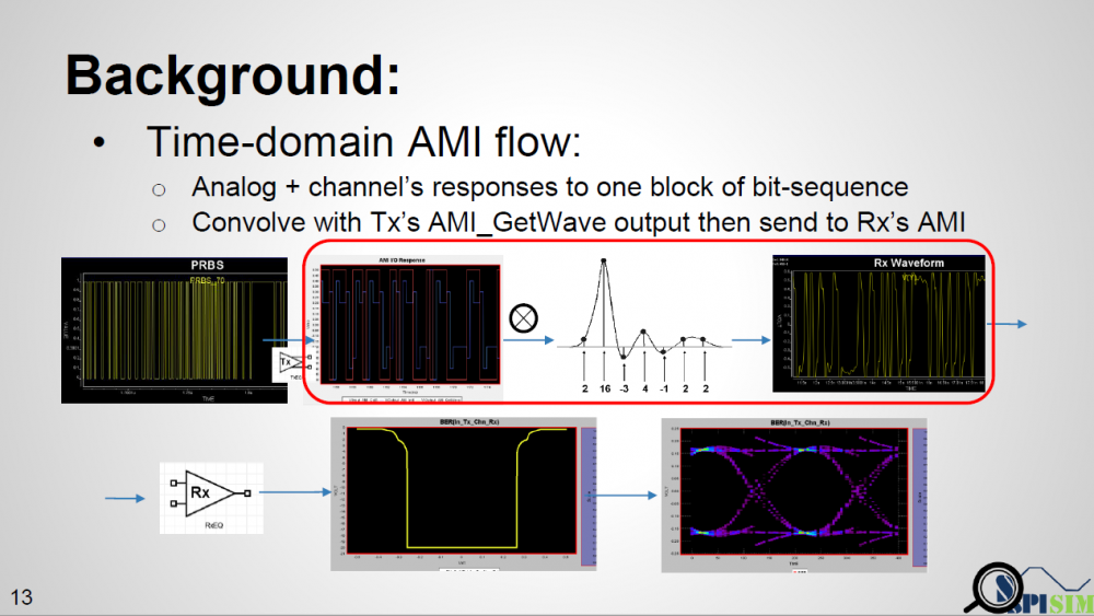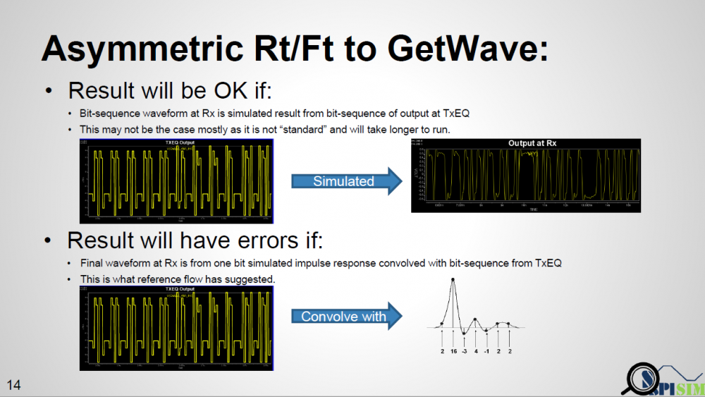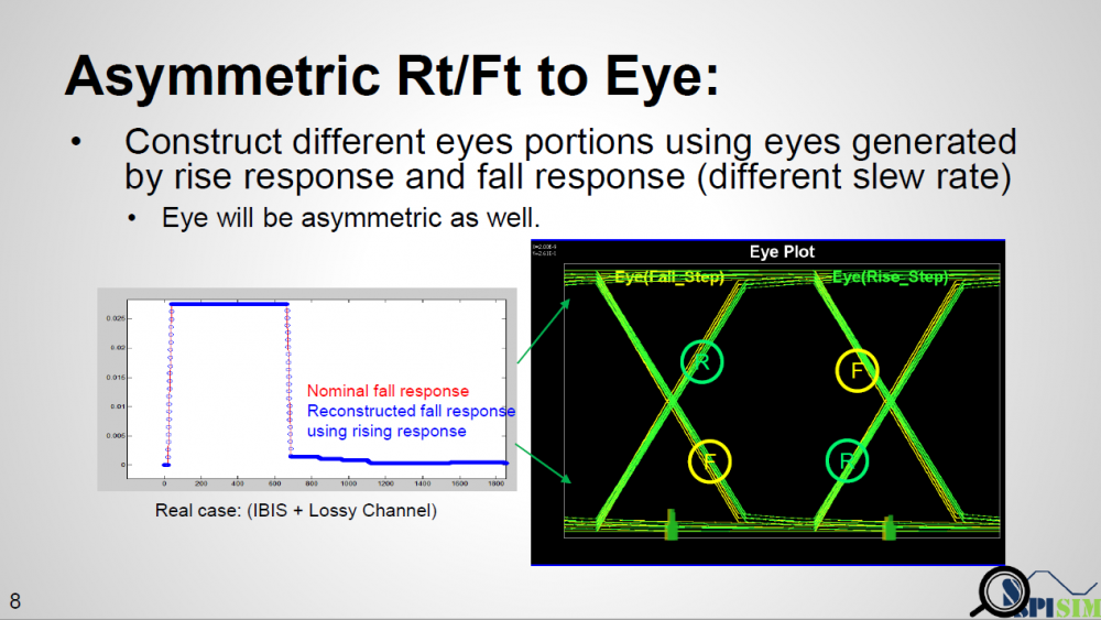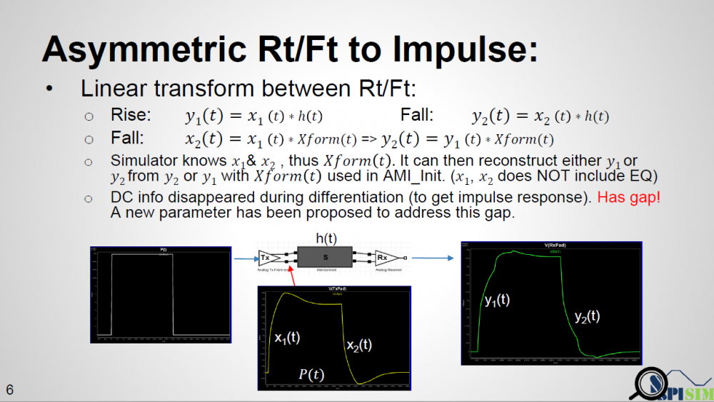 In this presentation, we discussed how existing AMI flow may be applied to asymmetric Rt/Ft such as those often seen in DDR case. A “smarter” EDA tool should be able to handle this situation without changing on spec.’s reference flow. When a channel analysis is performed in a “statistical” flow, an EDA tool can obtain waveform data at both Tx and Rx analog buffer’s pads during calibration process. Such data can be used to construct a transform function, XForm(t). With this function, impulse response through EQ can be reconstructed and thus built an asymmetric eye. Tree structure may be needed to keep track of possible bit combinations. In a “bit-by-bit” flow, the current spec. may be too specific as it forces to use convolution of TX EQ’s output with channel’s impulse response before sending to RX EQ. Such direct convolution may be problematic. A “smarter” simulator may calculate it using different method without changing data output from TX EQ and input to the RX EQ. Step response should be used as different Rt/Ft will cause “glitches” when consecutive ones/zeros are present if convolution method is used.