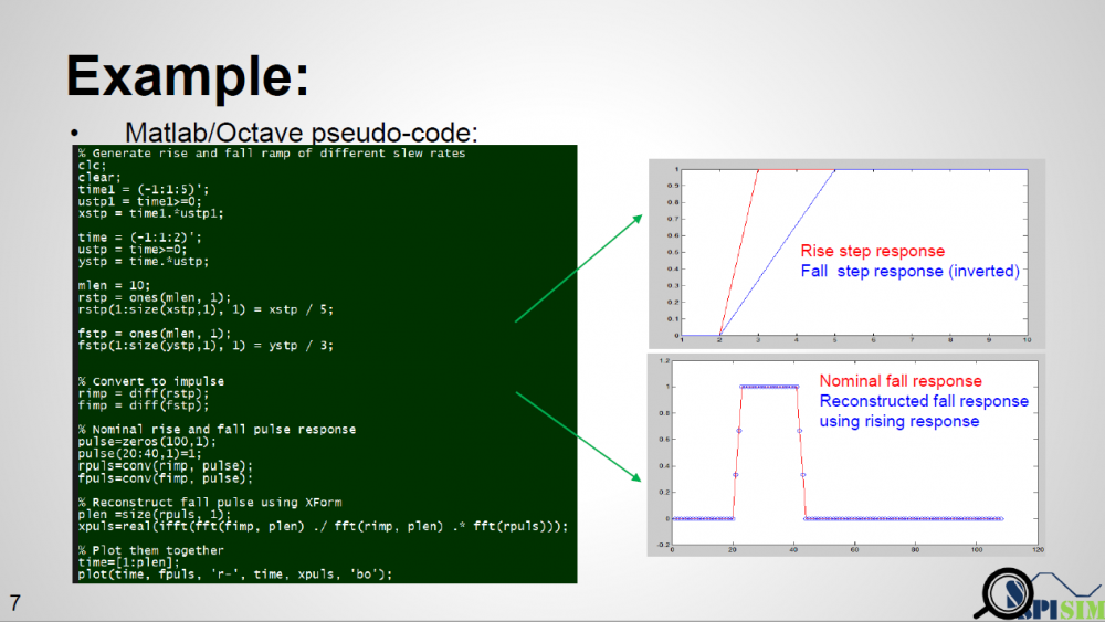 A simple matlab script has also been written to demonstrate occurrence of such “glitches”. This proves that not only using an impulse response to convolve with Tx EQ’s output is problematic, even using a full simulated pulse (which has asymmetric Rt/Ft’s effect) to convolve delta sequences (this delta sequence is original TX EQ’s output deconvolve with one digital bit) will still be problematic. Glitches will happen for consecutive ones or zeros due to the mismatches of Rt and Ft. Thus one must use rise step and fall step response instead when doing such kind of convolution.