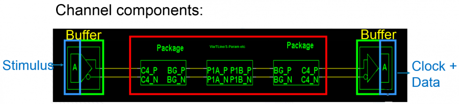Buffers sit at the driving and receiving ends of a channel. So while the passive channel is composed of models like transmission lines, vias and connectors, the models sit at both ends are buffer.