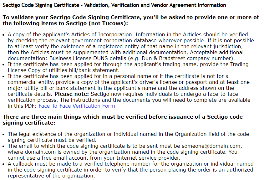 The issued certificate will delivered via a clickable link and can only be installed in the same browser used during application/purchasing process. It is very important that you install, export this certificate right away then backup to a different location. With backup certificate, you can use other computer to sign software or the same computer after OS re-install. You will also need this certificate as a file as part of the building and release process.
