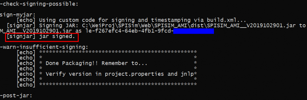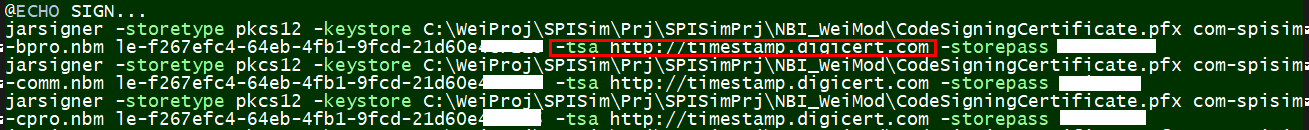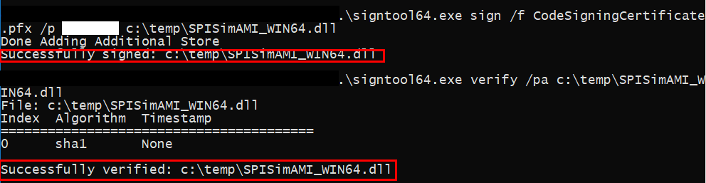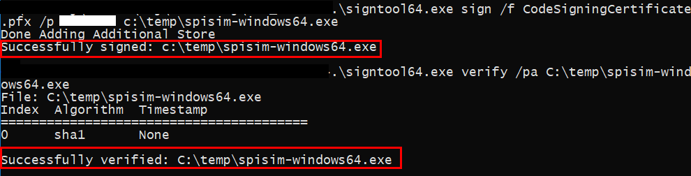 Once the certificate file is available, you may incorporate that into part of software releasing flow by signing and verifying the signature at the end of the building process. This is platform and OS-bit (32-bit or 64-bit) dependent. The white blocks below are password I used for using our certificate..
