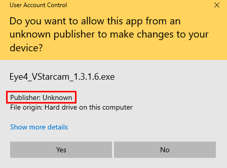 If your software is unsigned… such as the application shown below, users will see a “Publisher Unknown” info with yellow background. This may raise a red flag depending on your company’s IT or computer’s UAC policy settings.
