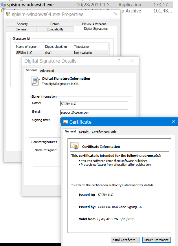 According to the wikipedia [HERE], code signing is a process of digitally “signing” executables to confirm the software author and guarantee that the code has not been altered or corrupted since it was signed. That is, if say SPISim creates an application or an AMI model, digitally sign then release them, recipients will be able to verify that the binary files they have at hand, regardless how they obtained them, are the originals. (I will use “software” to represent both executable and AMI models from this point as they are all binaries with programs.) If the software’s content was tampered … such as becoming corrupted during downloading or injected with malicious instructions, the digital signatures of the software will no longer be valid. This will be detected by the operating system or UAC (user account control). The digital signature is embedded inside the software. It only guarantees the source of the files but not their behaviors. So software may still have bugs or crash… only that you know who is the author to blame 🙂
