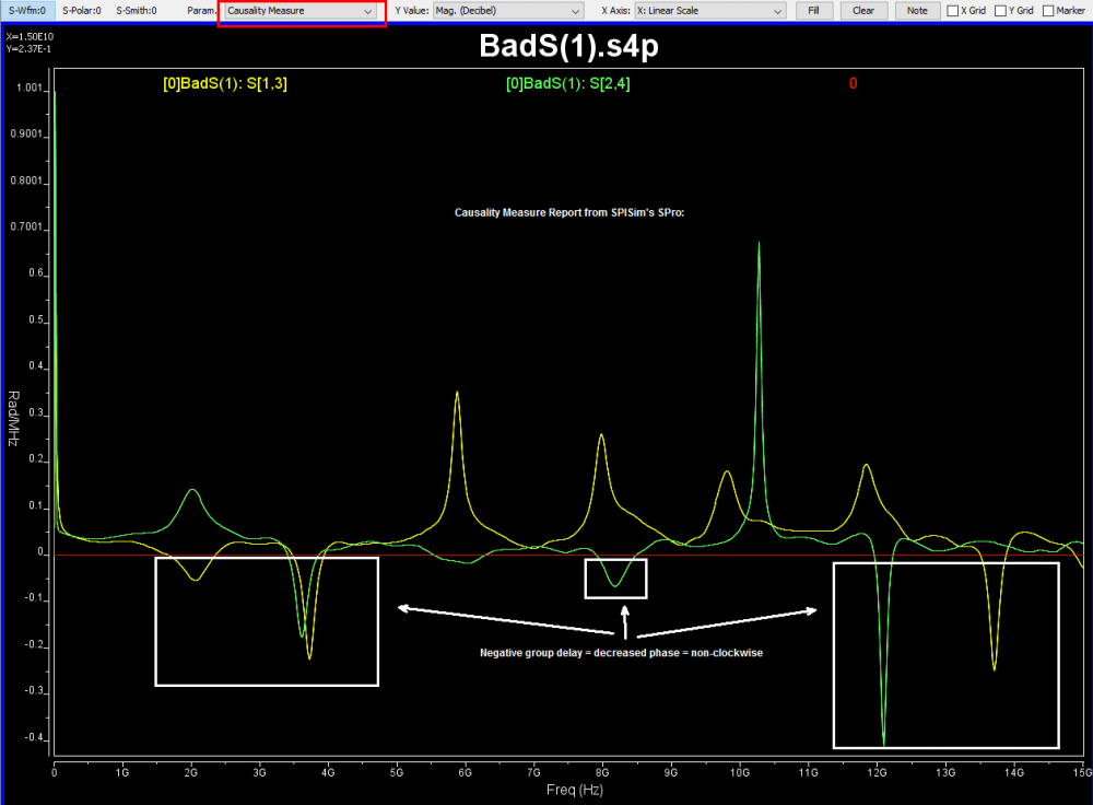 Often time, through type traces of a given s-parameter (S12 or S21) are used for iFFT for corresponding pulse or impulse responses. One can calculate this for each frequency of each through through type signal and have a summarized metric: Causality Quality Metric (CQM)