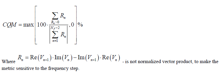The progress of phase between two adjacent vectors (Sf0, i, j to Sf1, i, j) can be calculated and normalized with their dot product and magnitude. The results should be a value falling between -1 ~ 1. Negative value represents decreasing group delay and thus a counter-clockwise phase change between these two vectors. This is where resonance has occurred. One can plot such measure against each frequency and got its visual representation: