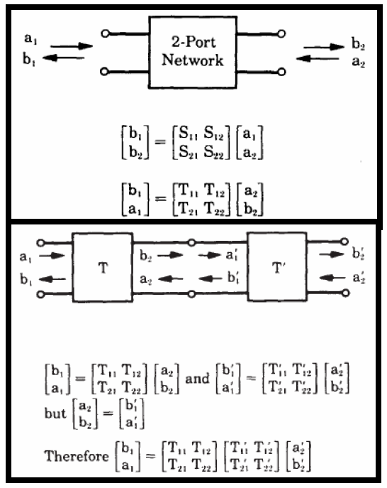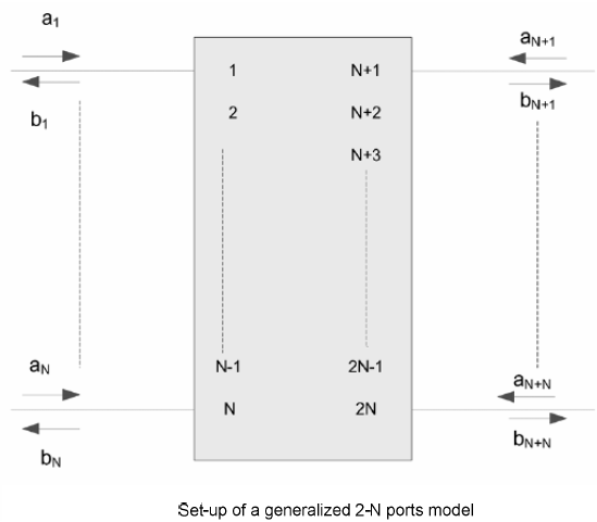 Usually an 3D field solver tool like HFSS/Q3D etc will extract physical design into a S-parameter.  For a homogeneous interconnect such as transmission line, 2D/2.5D field solver can be used to extract their RLGC/tabular model data. These RLGC data can easily be converted to corresponding S-parameters. So essentially all these stages’ device model can be in S-param. format and cascaded together. However, when there are more than two ports on each side… such as the schematic shown above, the basic two-port network formulas need to be “generalized” so that plain S/Z/Y/T/ABCD conversion formula can still be applied. That is, the ports needs to be arranged in such a way so that a “generalized 2-N ports” can be formed: