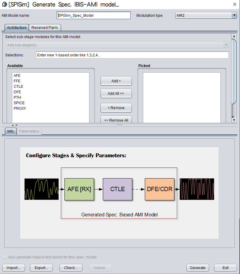It allows user to configure and generate IBIS-AMI model without any coding or compilation. Generated model can be run on 3rd party, commercial tools such as Mentor's HyperLynx, KeySight's ADS, Synopsys's HSpice and Cadence's SystemSI etc.
