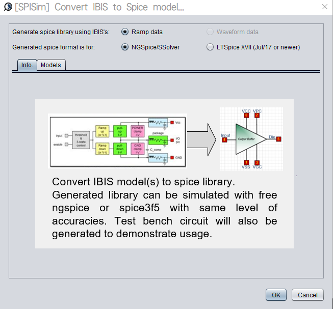 It allows user to convert an IBIS model to corresponding spice sub-circuit then simulate with free circuit simulator such as LTSpice, NGSpice or SSolver.