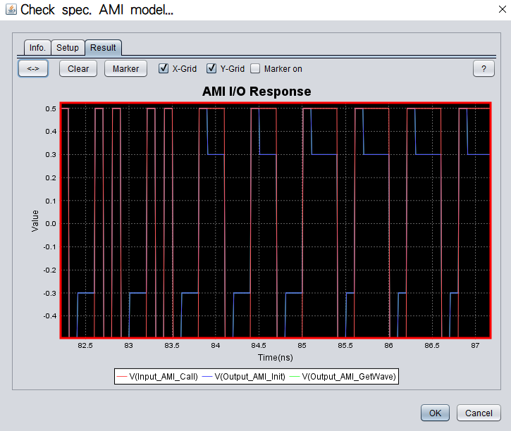 - AMI model's response will be displayed in the "result" tab. This waveform panel supporting zooming-in etc. Click the "?" button for usage.