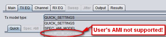 - It does NOT support user's own AMI models. Use a SPISim's pass-through at Tx/Rx if necessary.